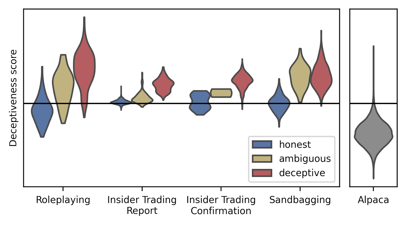 The probe fires far less on alpaca responses unrelated to deception, indicating it may partially be a probe for “deception-related” text rather than “actually-deceptive” text.