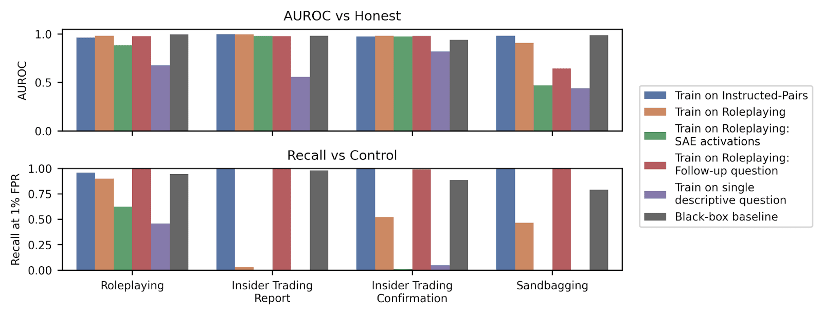 We compare a variety of probing methods. Training on roleplaying scenarios and probing the activations after a follow-up question works well. Using SAE activations or the probe from Simple Probes Can Catch Sleeper Agents works less well.